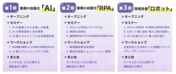 ASTEM及び京都市では、中小企業等のデジタル化・DXを推進することにより、生産性の向上や効率化等による経営基盤の強化や中小企業等の成長を促進しています。この度、9月から10月にかけて開催した営業DX等の講座に引き続き、「AI・IoT・ロボット技術」をテーマにした講座(全3回)を開催しますので、受講者を募集します。