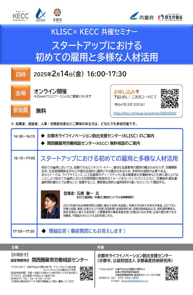 この度、国家戦略特区 関西圏雇用労働相談センター(KECC)と共に、スタートアップ創出及び成長促進を目的に、掲題オンラインセミナーを開催します。